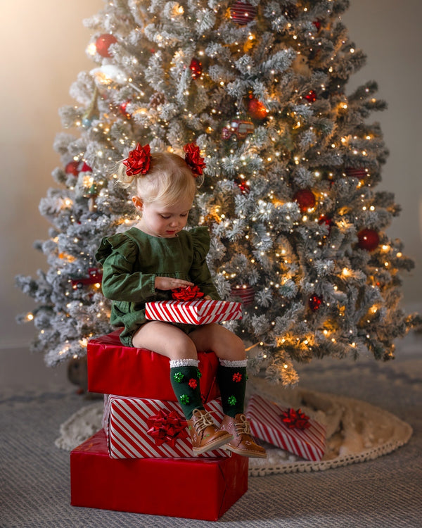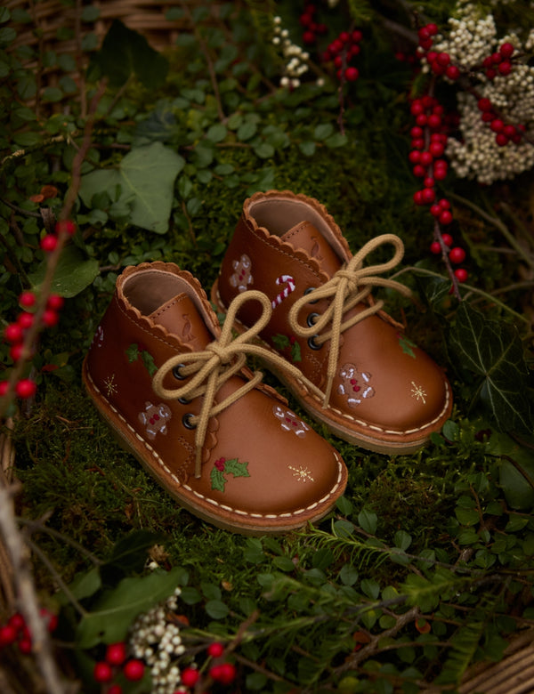 Gnistrende guldstjerner glimter på vores søde honningkagemand, omgivet af kristtjørn og juleslikstokke – ren julemagi.