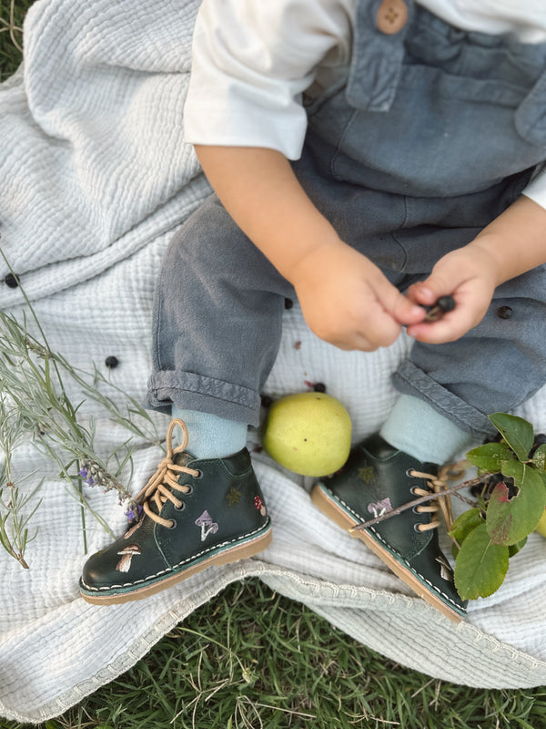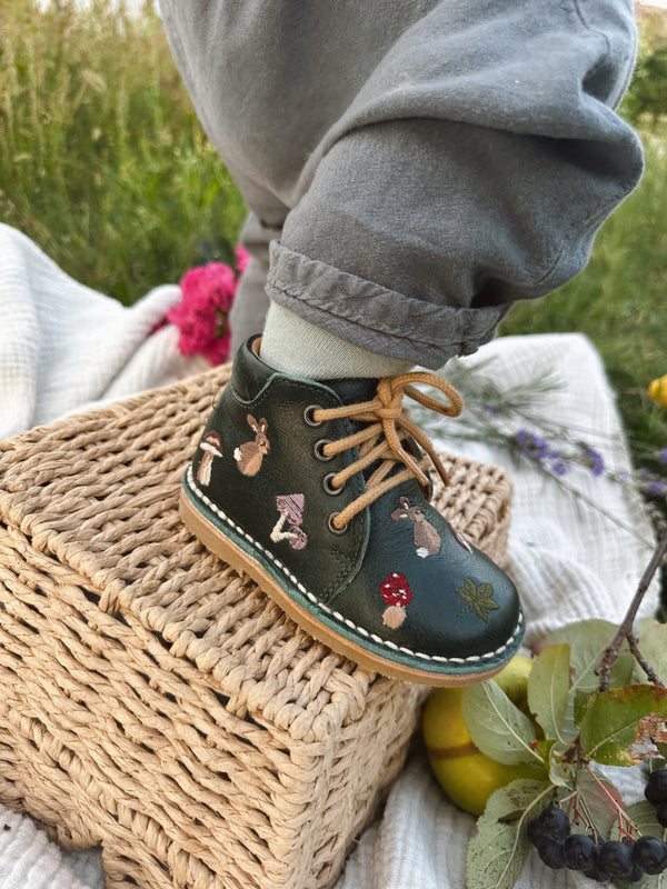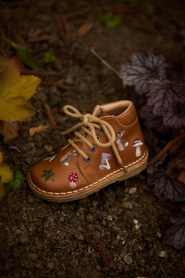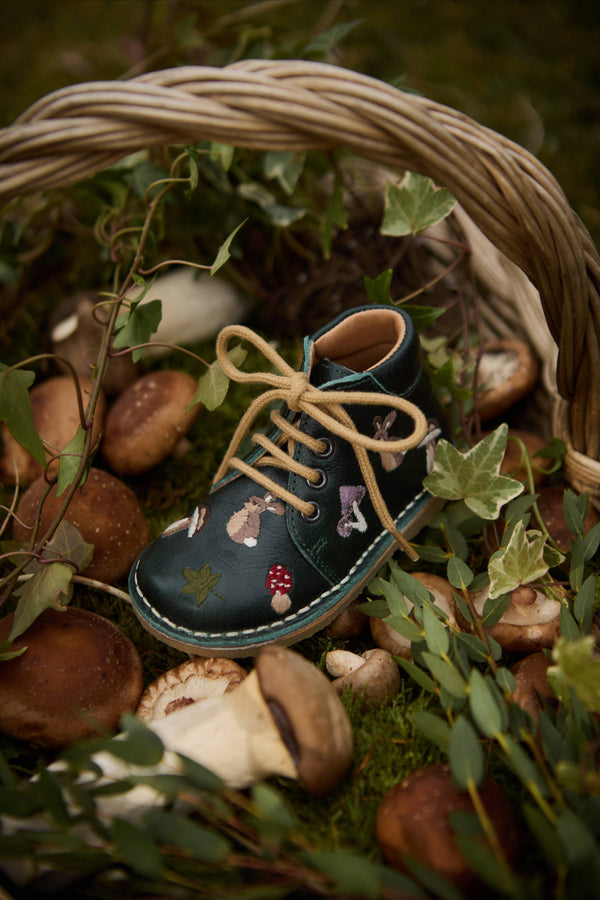Vi har skabt en fantastisk serie, der indfanger essensen af vores gamle historiske skove med deres raslende magiske blade. Oplev hoppende kaniner, ravfarvede blade og det mest pragtfulde og velsmagende udvalg af svampe. Den klassiske støvlesko har en fast støtte og den perfekte pasform til normale til bredere fødder. Denne sko er lavet af læder med et naturligt og kromfrit foer. Sålerne er fleksible og lavet af let genbrugt TR-gummi. Skoene har en god støttepude omkring anklen. Disse er velegnede som barnets første gåsko, hvis barnet har en normal til bred fod. Også meget velegnede til ældre børn. Alle sko er håndlavede i 100% kromfrit læder og ruskind. Det meste af vores læder er vegetabilsk garvet.