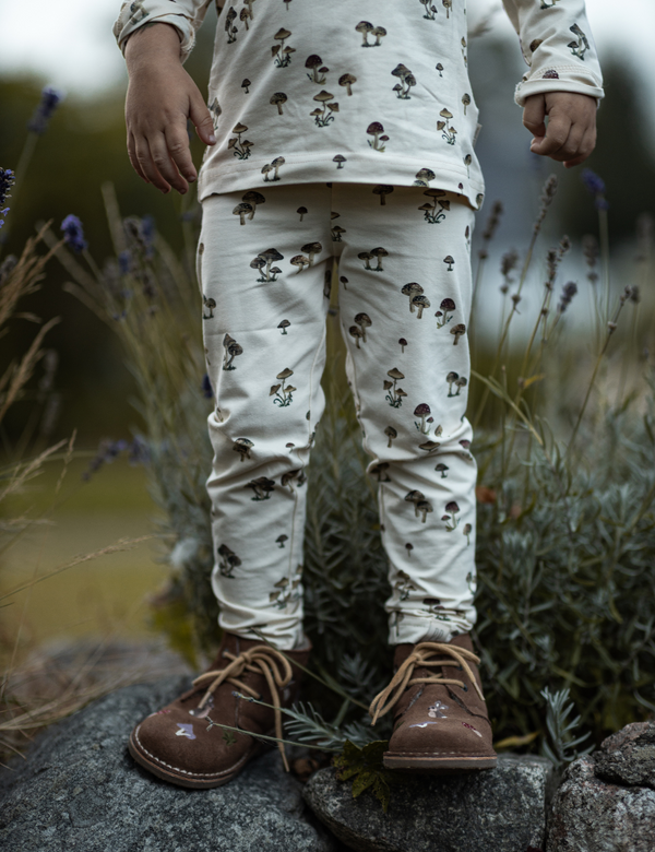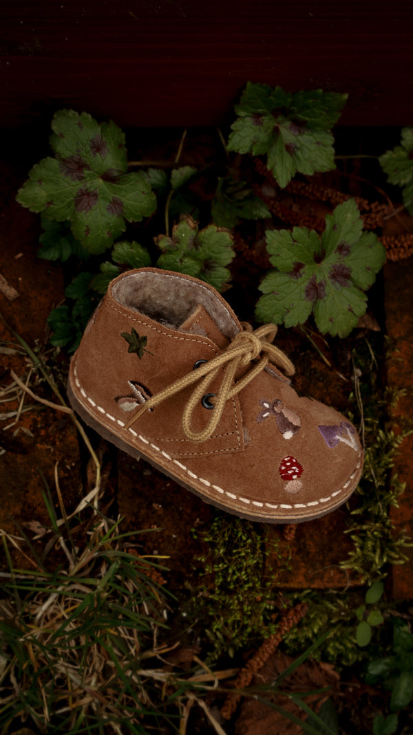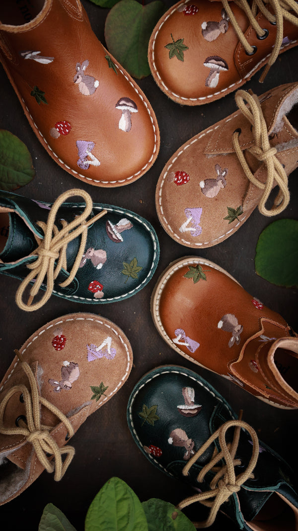 Vi har skabt en fantastisk serie, der indfanger essensen af vores gamle historiske skove med deres raslende magiske blade. Oplev hoppende kaniner, ravfarvede blade og det mest pragtfulde og velsmagende udvalg af svampe. Vores tidløse ørkenstøvler er lavet i læder og foret med vegetabilsk garvet læder. Sålerne er fleksible og lavet af letvægts, genbrugt TR-gummi. Disse er ikke kun beregnet til de små, men også yderst velegnede til ældre børn. Alle sko er håndlavede i 100% kromfrit læder og ruskind. Det meste af vores læder er vegetabilsk garvet.